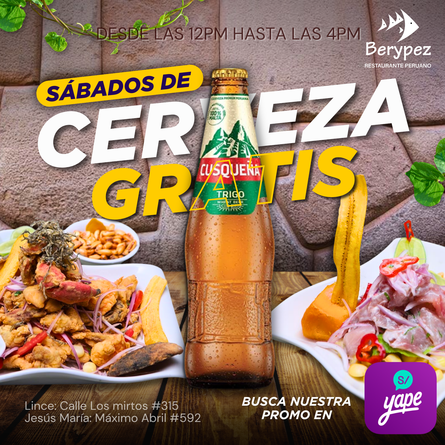Filete de pescado 200 GR o entero de 550 GR chicha de jora, tomate, cebolla. Yuca perfumada con culantro, acompañado de arroz.